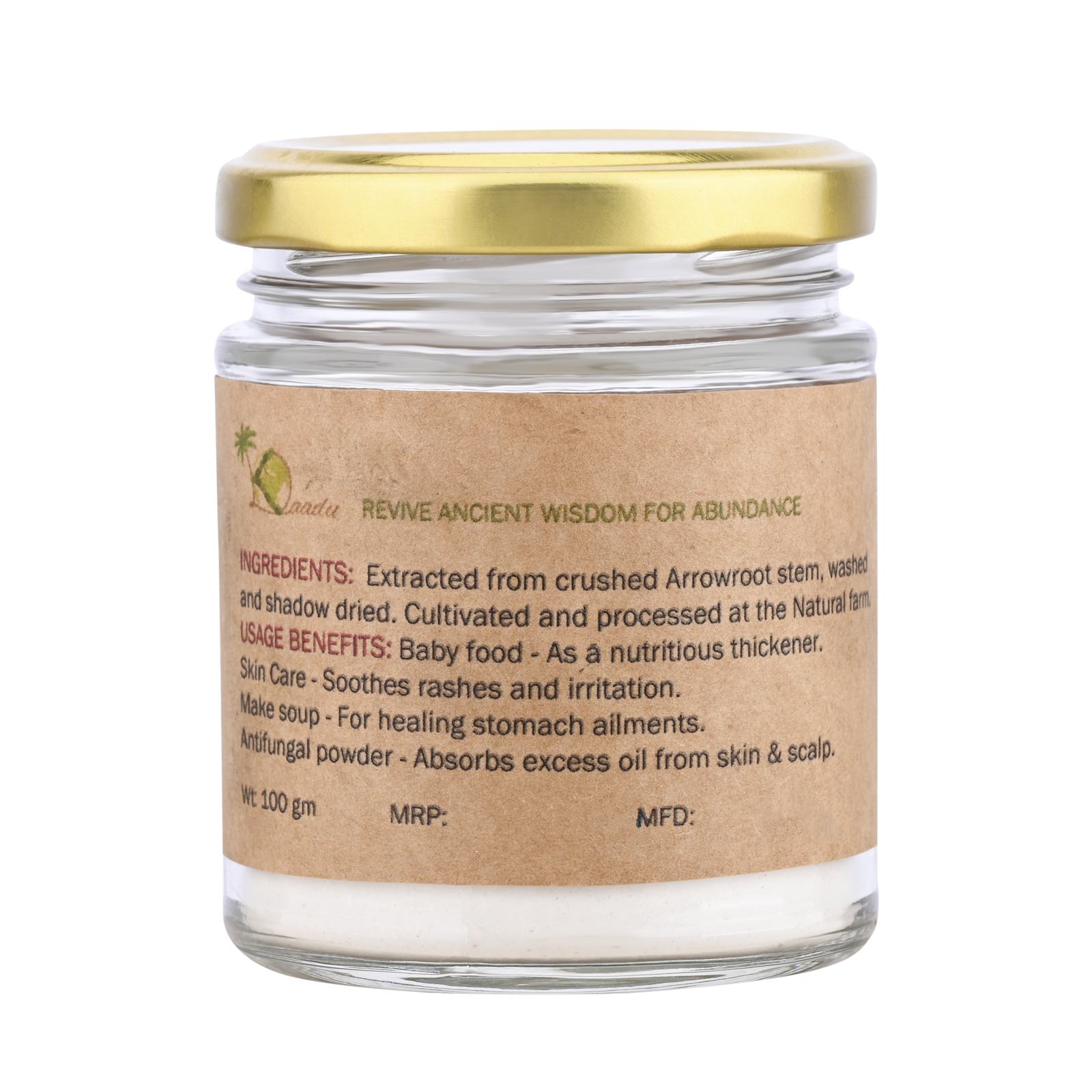 Extracted from crushed Arrowroot stem, washed and shadow dried. Cultivated and processed at the Devara Kaadu Natural farm