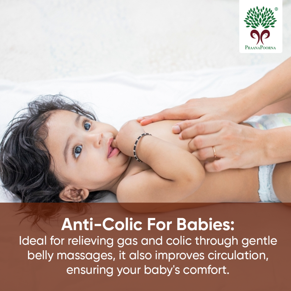 To Relieves gas and colic: Take small amount of oil and gently massage, focusing on the tummy for anti-colic benefits.