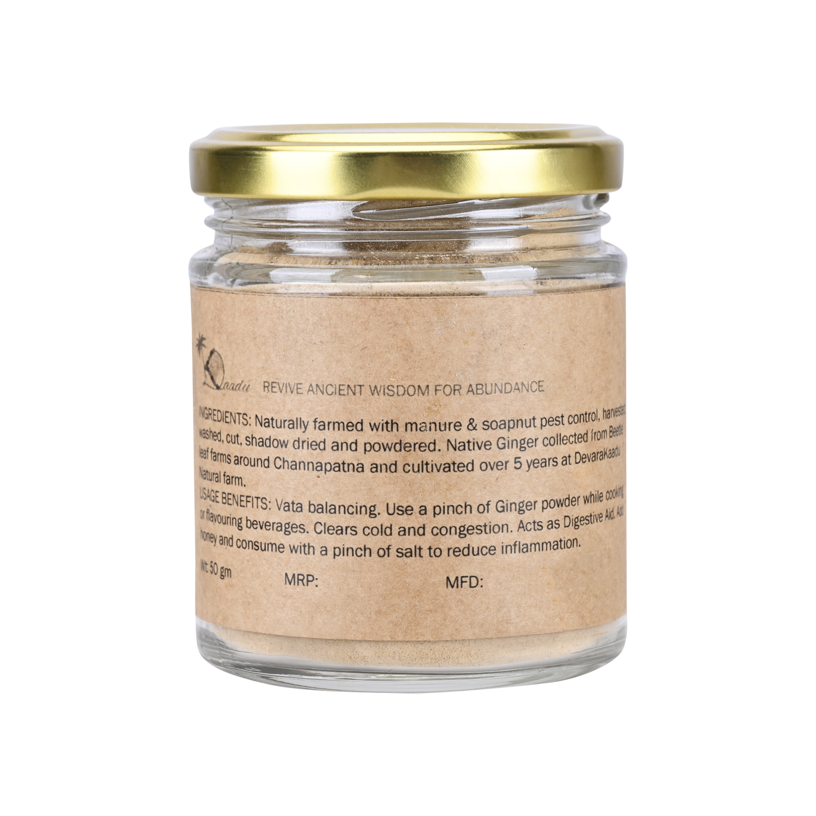 Naturally farmed with manure and soapnut pest control Harvested, washed, cut , shadow dried and powdered. Native Ginger collected from Beetle leaf farms around channapatna and cultivated over 5 years at DevaraKaadu Natural farm.