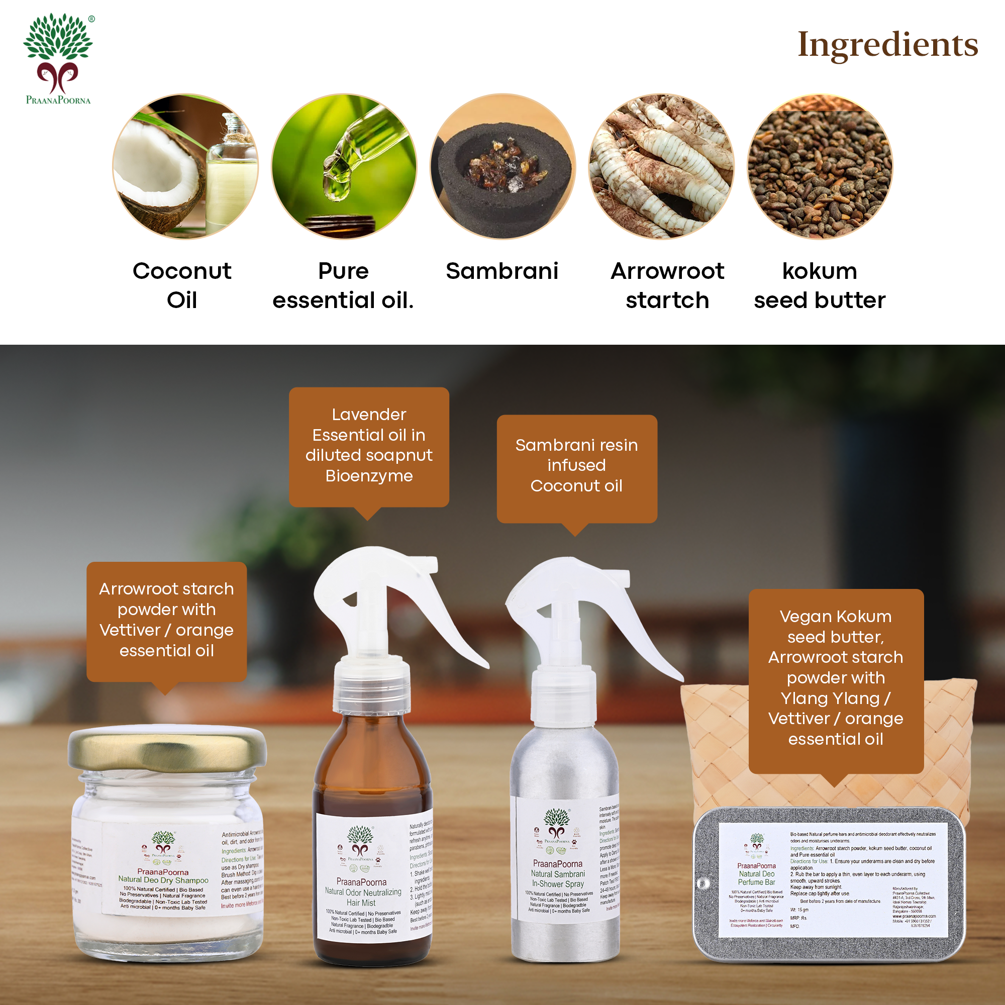 Ingredients:Coconut Oil,Sambrani,Arrowroot starch,kokum seed butter and Pure essential oil.